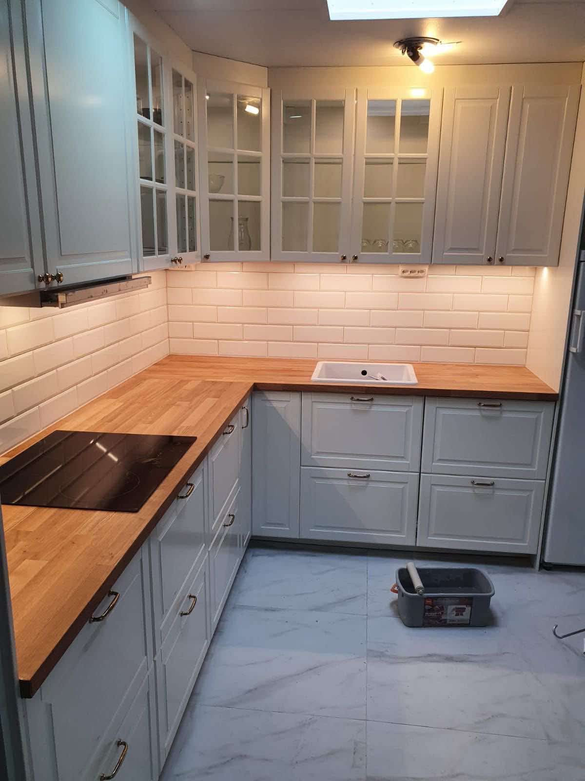 Här har vi lagt eleganta 60x60 klinker för en modern och hållbar yta. Därefter monterade vi köket med precision för ett stilrent och funktionellt resultat.