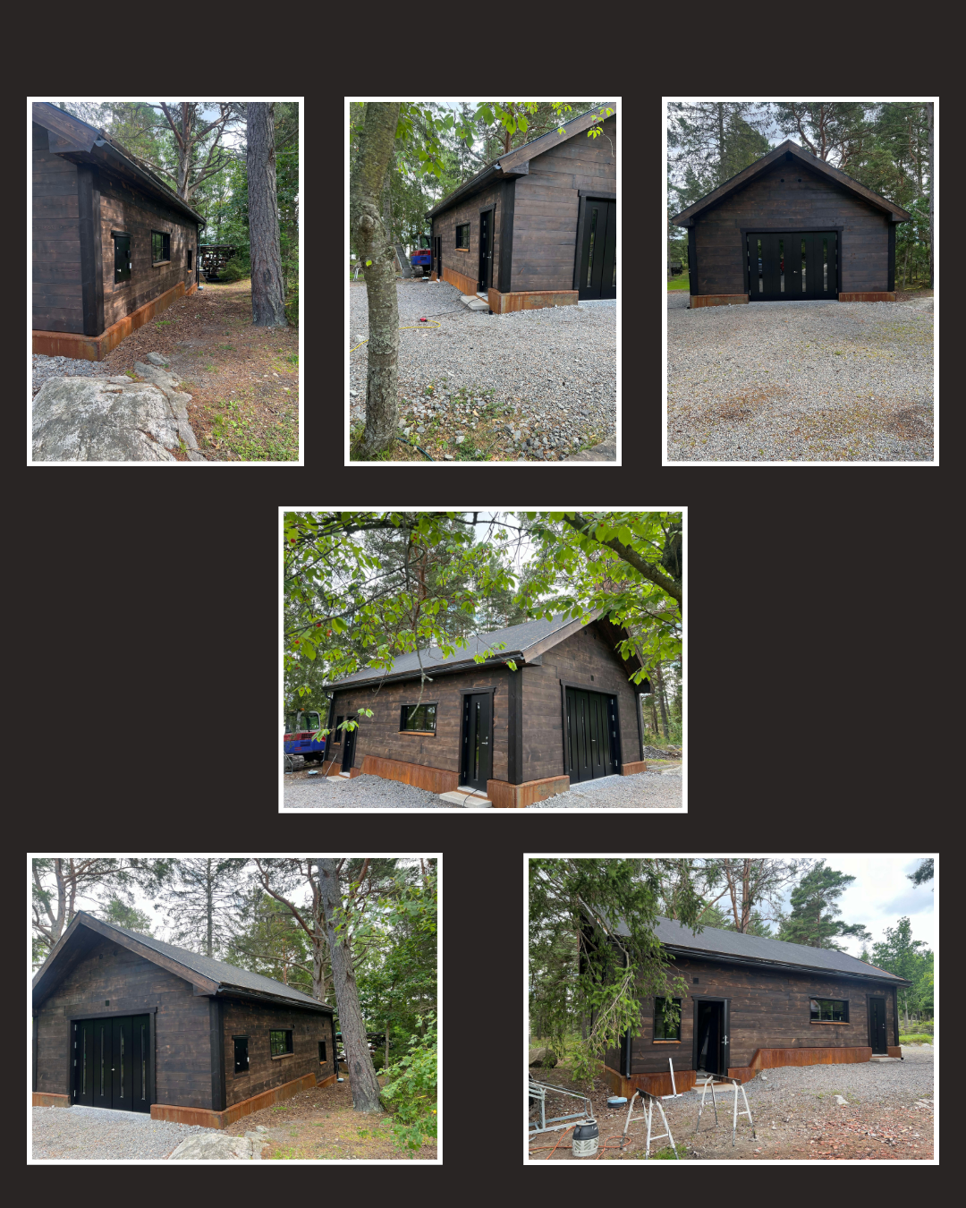 Detta projekt har vi bränt och oljat trävirket för en stilren och hållbar finish. Det slitstarka asfalttaket ger långvarigt skydd, och den mörka färgsättningen skapar en modern och elegant helhet.