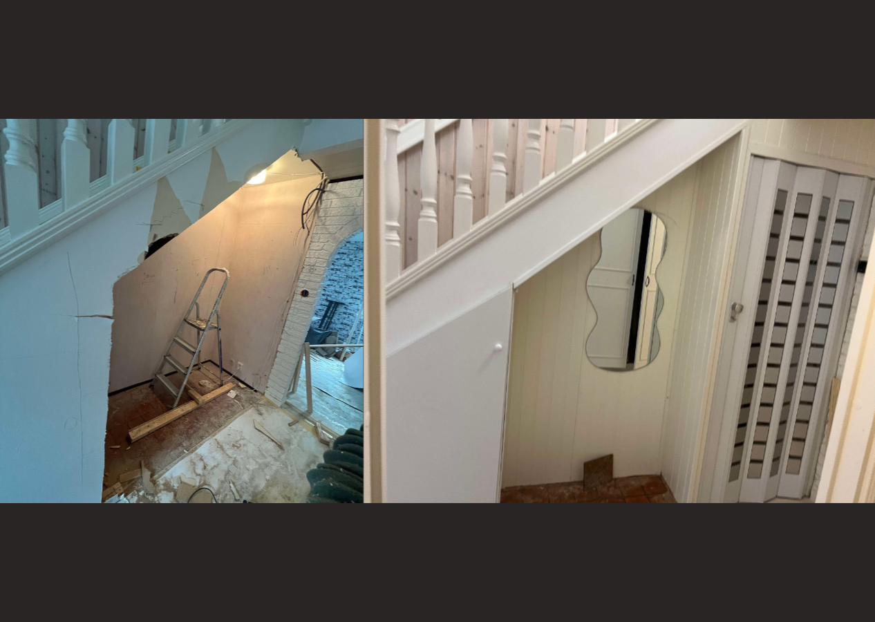 Anpassad förvaring Vi har förvandlat ett tidigare outnyttjat utrymme under trappan till en stilren och praktisk del av hemmet.